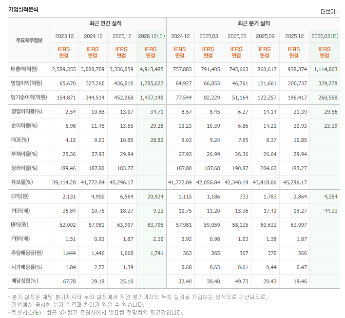 영업이익은 분기별로 회복세가 뚜렷하다. 메모리 가격 반등과 AI 반도체 수요 확대가 실적 개선을 견인하고 있다. 구조적 턴어라운드 구간에 진입한 모습이다.