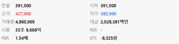 - 시가 / 고가 / 저가: 400,500원 / 427,000원 / 399,500원