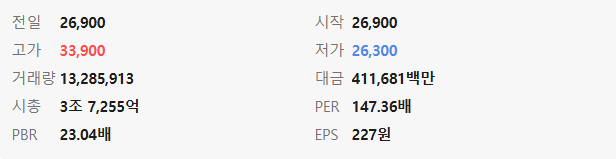 - 시가 / 고가 / 저가: 26,900원 / 33,900원 / 26,300원