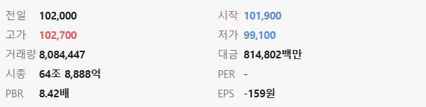 - 시가 / 고가 / 저가: 101,800원 / 102,700원 / 99,100원